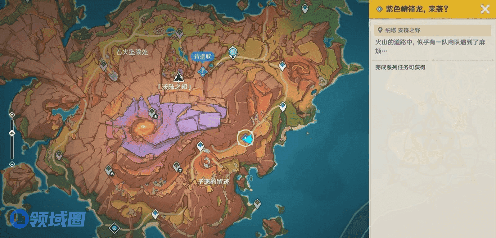 要触发紫色嵴锋龙来袭,首先需要前往纳塔区域,具体位置位于沃陆之邦·孑遗的留迹右上方山路。
