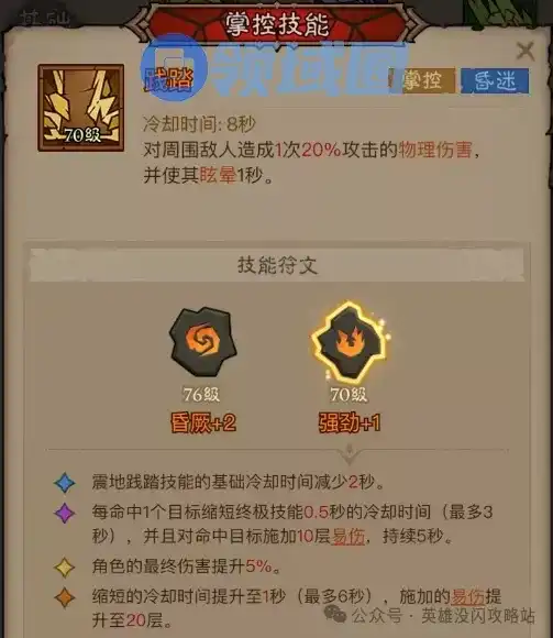 思路:冲锋——擂鼓用于群怪环境,如暗能秘境等,聚怪的同时提供能量恢复,也可以在PK时提供免控效果;践踏——强劲用于处理单体BOSS场景,减少终极技冷却时间,增加最终伤害并提供易伤叠层。