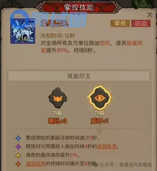 思路:联动释放集结怒吼,使集结怒吼释放时有概率同时释放战争怒吼提高最终伤害