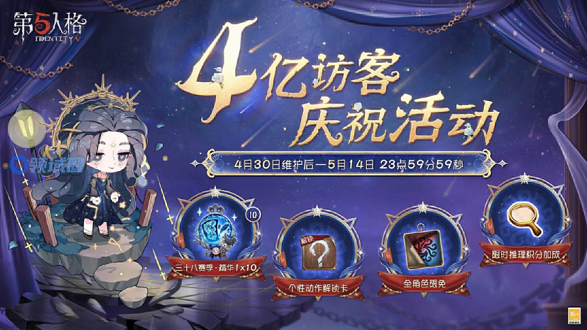 4亿访客庆祝活动将于4月30日维护后开启。活动期间登录游戏,即可收到内含【第三十八赛季·精华1×10】和【个性动作解锁卡】的赠礼,全角色限时免费和限时推理积分加成也将同步开启~