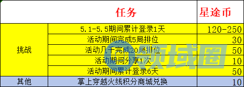 挑战获取星途币环节,是本期瀚海星途活动获得星途币的重中之重,在5.1-5.5日期间登录一天即可随机领取120枚-250枚星途币,活动期间完成5局、20局排位即可分别领取30枚、50枚星途币,活动期间分享一次即可领取10枚星途币,在活动期间累计登录6天可以领取50枚星途币。