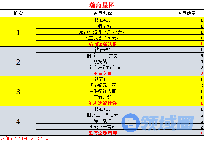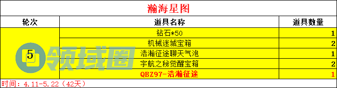瀚海星途抽奖活动将在4.11与大家见面,5.22结束共计42天,关于瀚海星途抽奖方面一共有5轮,每一轮都是豪礼满满,让我们一起来看一下可以获得哪些道具吧!