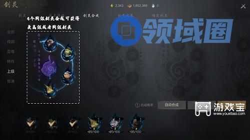 当然你没有抽到好的剑灵,也可以通过剑灵合成来获取更强的剑灵,合成4个同级剑灵(需要25个相同剑灵结晶才可以合成一个剑灵,重复获得已拥有的剑灵会自动转化为25个对应剑灵结晶)就可以获得更高级或者同级的剑灵。