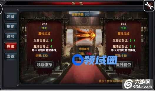 爵位界面可看到自己当前的爵位以及所加成的属性,同时每个不同的爵位每天都能领取不同的俸禄,升级爵位需要达到相应的等级和功勋,只要满足这两个要求才能提升爵位。