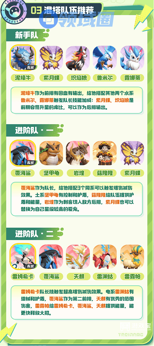 阵容推荐:覆海鲨、坚甲龟、岩煌、菇隆隆、紫月蝶。
