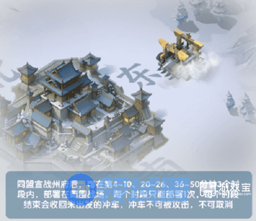 这三个时间段内,武侯或者盟主可以在黑土地内布置一次冲车,部署之后,然后设定进攻时间。冲车不可被攻击,不可被取消。改版之后的冲车无需派队伍驻防防守,只需要由车头带领车身进入集结,然后发车即可,因为冲车的进攻逻辑为由驻守在冲车内的成员,转换为集结队伍,对城池内驻防的守军发起冲击。
