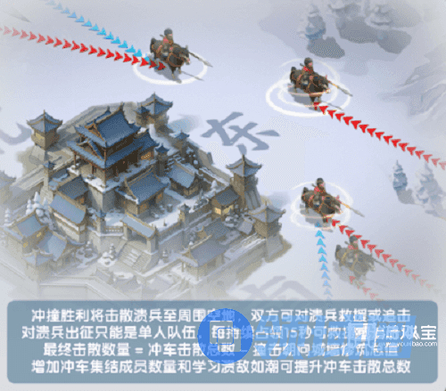 冲撞城池胜利可以击散溃兵到周围空地,冲车方和守城方需要对溃兵进行追击歼灭或者救援回城,救援成功则回复1点守军血量,反之被冲车方追击成功,不回复血量。