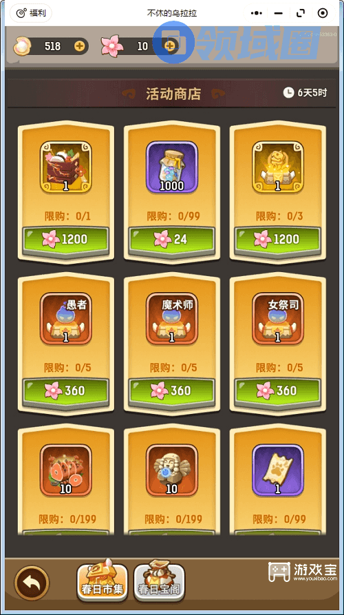 不休的乌拉拉小程序最近新上线了春日踏青的活动,玩家需要通过珍珠或者氪金来获得樱花,樱花达到一定数量后就可以兑换道具,游戏宝小编带来不休的乌拉拉春日踏青活动兑换码攻略,不知道怎么兑换的玩家可以参考一下。