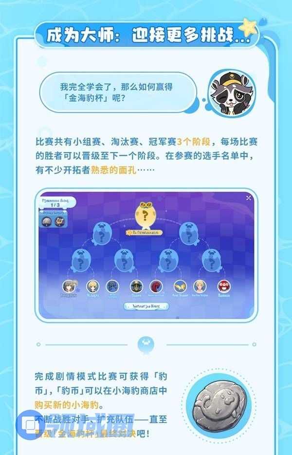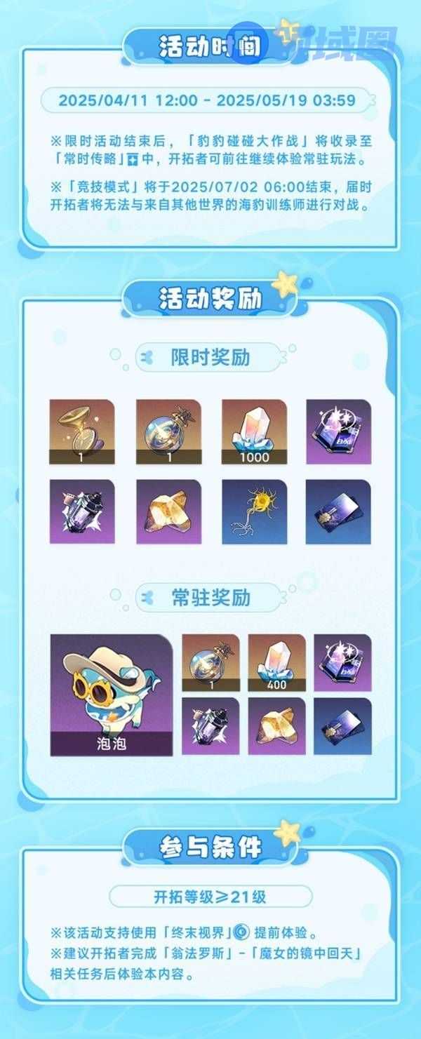 崩坏星穹铁道豹豹碰碰大作战活动,作为本次更新后的又一新玩法,我们要如何才能获得游戏中的奖励呢?作为传说中的「预言之子」,你将与奇美拉「泡泡」携手,带领可爱的小海豹们在水上碰撞比赛中勇夺冠军。从小组赛到冠军赛,每一场胜利都将为你赢得丰厚的「豹币」奖励,用于解锁更多萌趣海豹伙伴。