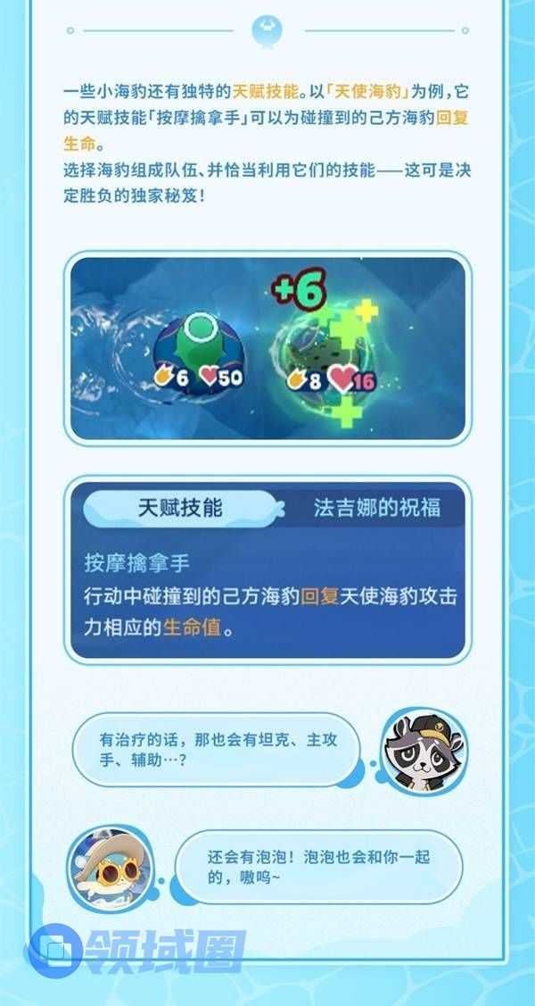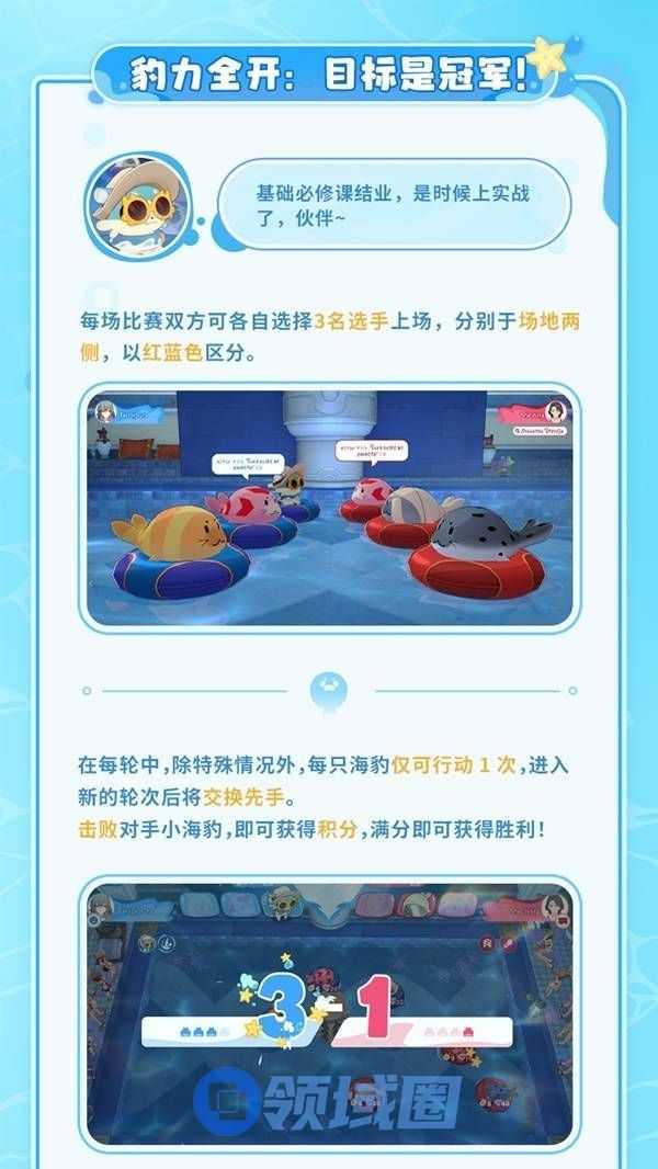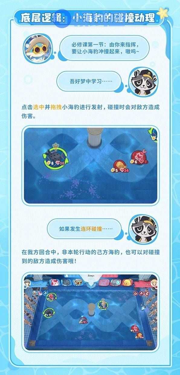 ● 在「豹豹碰碰大作战」中,开拓者将与奇美拉「泡泡」一起,带领小海豹获得水上碰撞比赛的冠军。比赛共有小组赛、淘汰赛、冠军赛3个阶段,在比赛中不断战胜对手即可晋级。