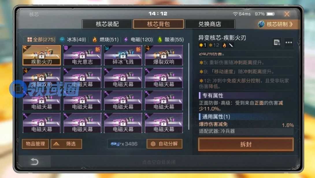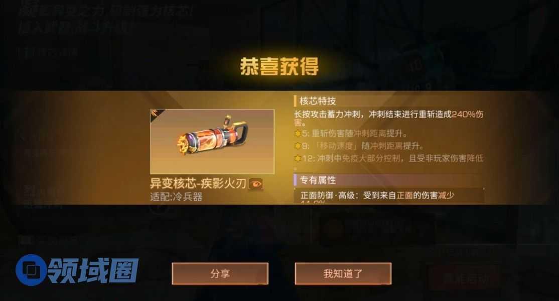第一种核芯名为疾影火刀,我方装配后能长按进行蓄力。并用更快的速度向前冲刺,冲刺的途中还可滑动进行转向。每移动四十的距离,都能造成一次小范围AOE。松开键或者力气耗尽之后,能结束冲刺并造成重斩。