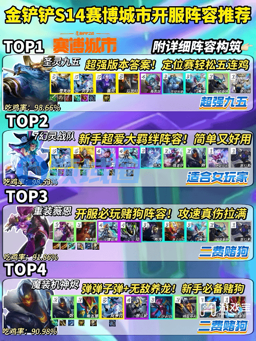 金铲铲之战最近更新了s14赛季,同时新增了很多全新的羁绊和棋子,其中最热门的就是赛博城市这套阵容了,游戏宝小编带来金铲铲之战s14赛季赛博城市阵容推荐攻略,不知道怎么搭配的玩家可以参考一下。