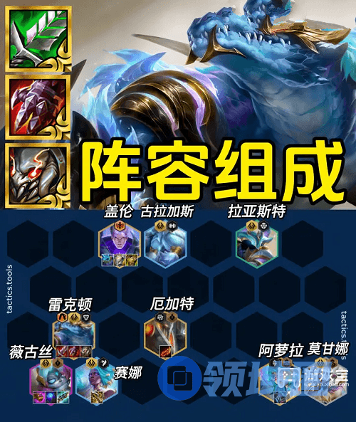 阵容组成:盖伦、古拉加斯、拉亚斯特、雷克顿、厄加特、薇古丝、赛娜、阿萝拉、莫甘娜。