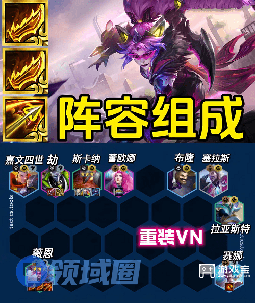 阵容推荐:嘉文四世、劫、斯卡纳、蕾欧娜、布隆、塞拉斯、拉亚斯特、维恩、赛娜。