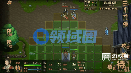 3、点击武将即可控制武将行军位置,可在界面查看武将信息以及技能介绍。每次行动只能选择一个操作(技能/攻击)然后结束回合!请根据实际情况进行战棋调整。