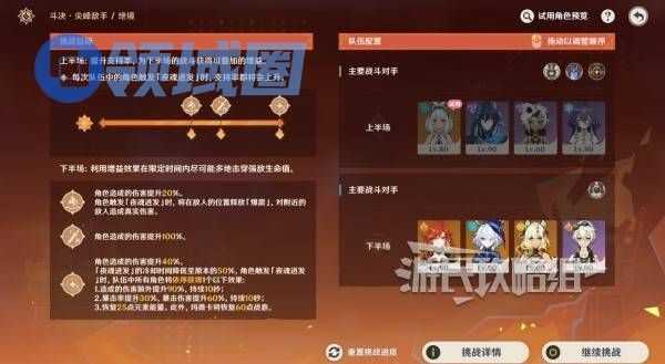 注意下半场的挑战可以在继承上半场支持率的状态下重新进行,无需再重新打上半场,离开挑战后可以在队伍配置界面直接更换。如果想要重新挑战上半场,直接点击界面下方的重置挑战进度即可。