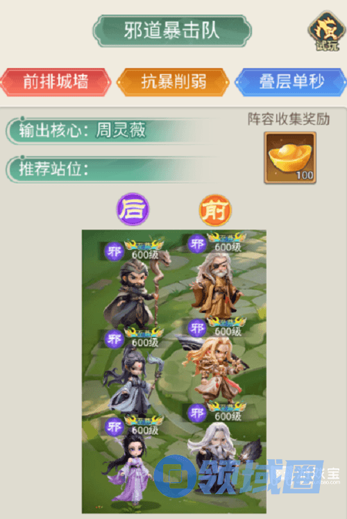 邪道阵营队有三大特色:前排城墙、扛暴削弱、叠层单秒,由这几位侠客组成:紫蛤王、七星真人、谢无极、任楚狂、红尘仙子、周灵薇。