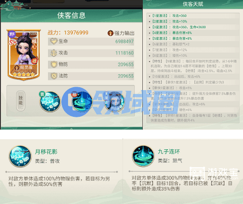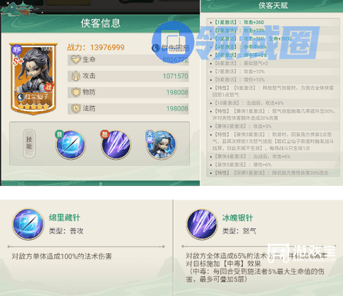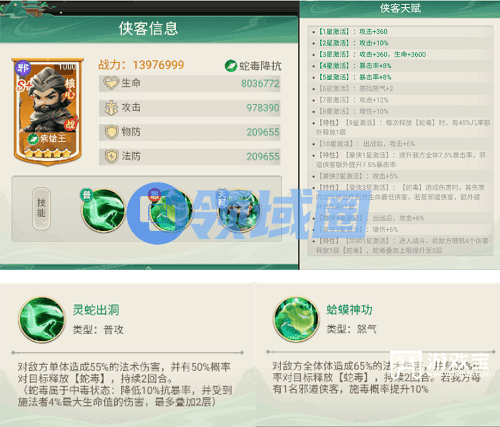 与其他依靠血厚的肉盾侠客不同,不走寻常路的谢无极主要通过高闪避率来保证自身生存。同时他还能窃取目标的最大生命值来提升血线,血量越低吸血率越高,从敌方视角看残血谢无极可谓是“看不惯又干不掉”~高星级的谢无极还可以与紫蛤王打配合为敌方奉上中毒异常的伤害大餐。