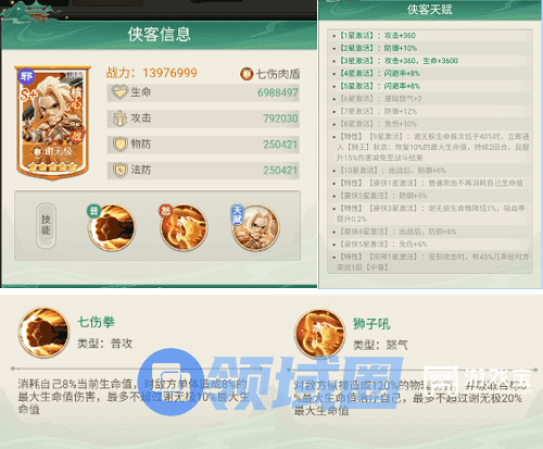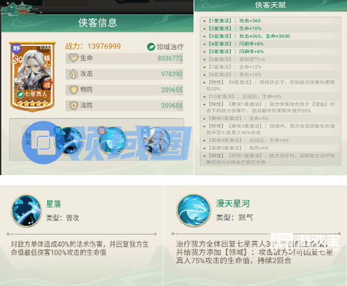 七星真人在自身开启领域后具备减伤、增伤、持续回血的功能,星级达到宗师后甚至可以在敌方回血时治疗我方全体侠客,是一位非常强力的核心侠客。