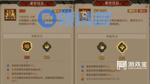 第一个掌控技能上面选择践踏!搭配上符文昏厥!主打一手控制与减伤,增加更多容错率!第二个掌控技能上面选择战争怒吼,增加我方最终伤害!符文选择杨志!提高角色暴击以及最终伤害,并且获得一手免控效果(免疫击飞、眩晕、冻结等控制效果),使我方输出更加给力!