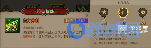 终极技能上面选择蛮力穿刺,可以对目标施加重创效果(目标每次受到直接伤害,额外施加35%攻击的创伤效果),搭配撕裂以及痛割,让创伤进行到底!符文选择蛮劲,每次命中都可以额外施加重创(每层重创可以使后续再被施加的创伤量提升5%,最多叠加30层提升150%),这个终极技能也是此流派输出的核心技能!