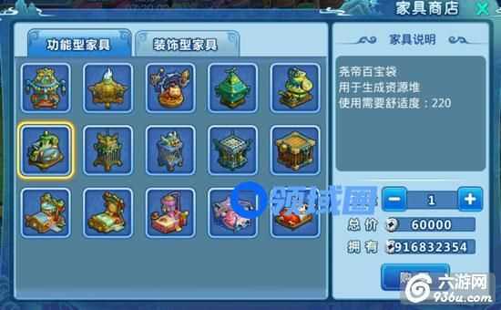 第一,你先购买一个生成资源堆的家具——尧帝百宝袋。这是一个功能型的家具,当舒适度达到220时,就可以生成资源堆。
