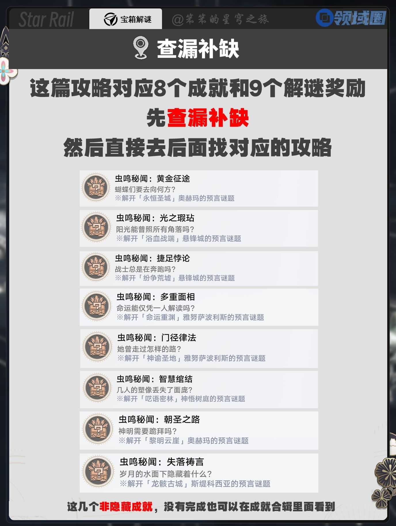 崩坏星穹铁道虫鸣秘闻一共有8个,这篇攻略对应的是8个成就和9个解谜奖励,我们要开始前需要先去查漏补缺,然后直接去后面找对应的攻略就可以了!这几个非隐藏成就,没有完成也可以在成就合辑里查看到的。