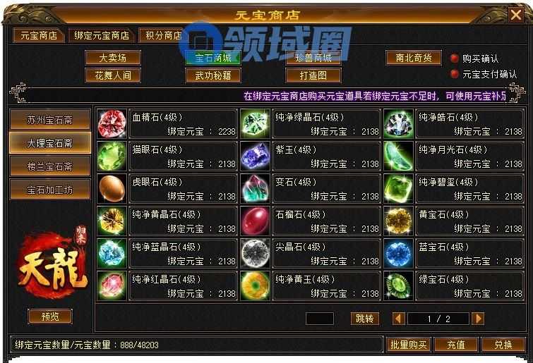 绑元也能买宝石!价格优惠,童叟无欺!还有门派技能书、打造图、金蚕丝等道具同时上架,买不了吃亏,买不了上当,各位大侠们走过路过,千万不要错过啦!