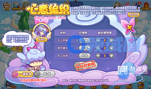 4、编织蝴蝶,需要准备好以下材料:云上织棉、雾中露水、风之丝线。每种材料可以通过提交材料获取,如:果儿糖x3、可可果x5等。