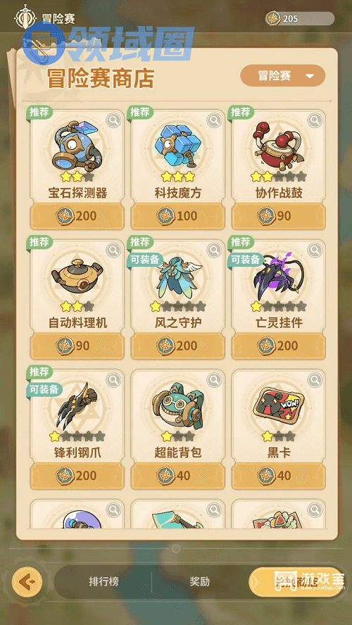 ①冒险赛每次结算可以根据当前的排名领对应的冒险币,然后去商店里兑换秘宝。