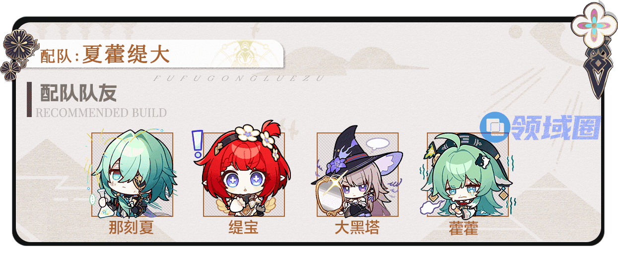 在这个配队中,那刻夏作为智识辅助位进入配队,主要通过其优先攻击未命中目标的弹射与稳定的2回合5动的攻击频率来满足大黑塔的双智识需求、叠层需要与回能需求。同时双智识的配置也可以触发那刻夏的额外能力,为全队带来大量增伤效果,使队伍整体造成的伤害大幅提升。大黑塔则作为主要输出角色入队,通过那刻夏激活天赋增加倍率,并发挥出一定暴击伤害辅助的效果,使队伍整体造成的伤害大幅提升。而缇宝与藿藿则以副C/辅助的定位入队,在提供一定辅助增益的同时,满足队伍整体的能量循环。