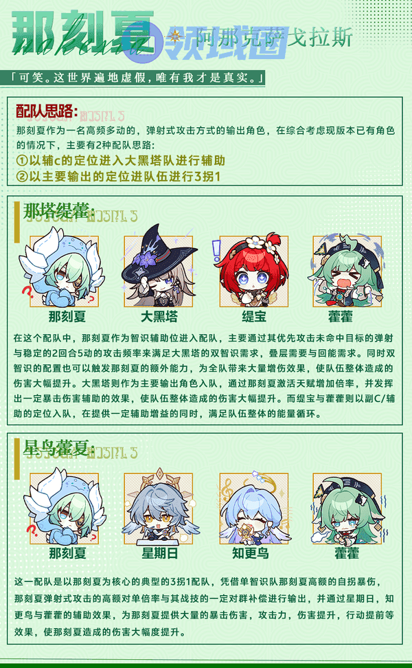 Tips:由于那刻夏可以稳定2动1大并适配风套,在搭配星期日/布洛妮娅时可以适当降速堆输出,依靠风套拉条超车,常见配速(不记入其他拉条效果)为那刻夏速度>3/4星期日速度,比如说那星期日134速、那刻夏101速的配速。