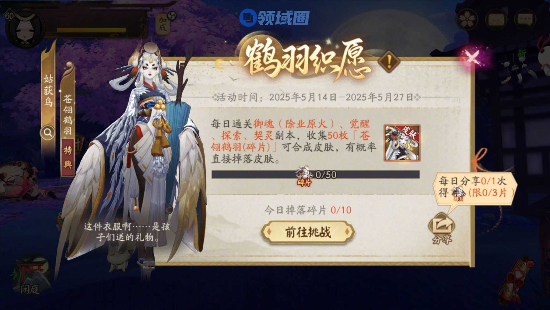 ※活动期间,大人通过御魂(除业原火)、觉醒、探索、契灵副本时,有一定几率获取「苍翎鹤羽(碎片)」(每日通过挑战副本最多获取10枚),还有机会直接获取「苍翎鹤羽」皮肤!