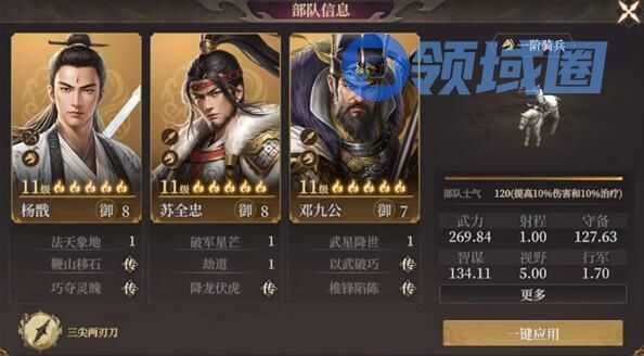 三武将全点武力。邓九公带以武破巧/袖里乾坤/纵地金光,提升全队输出能力并赋予连击。苏全忠或赵公明自带术法赋予敌方易伤(受到的物理伤害提升)效果。杨戬凭借自带术法的高额增伤打出爆炸伤害。