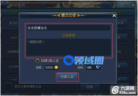 B、输入您的公会名称和宣言,就可以创建公会啦!(温馨提示:使用钻石可以快人一步,直接创建2级公会哦!)