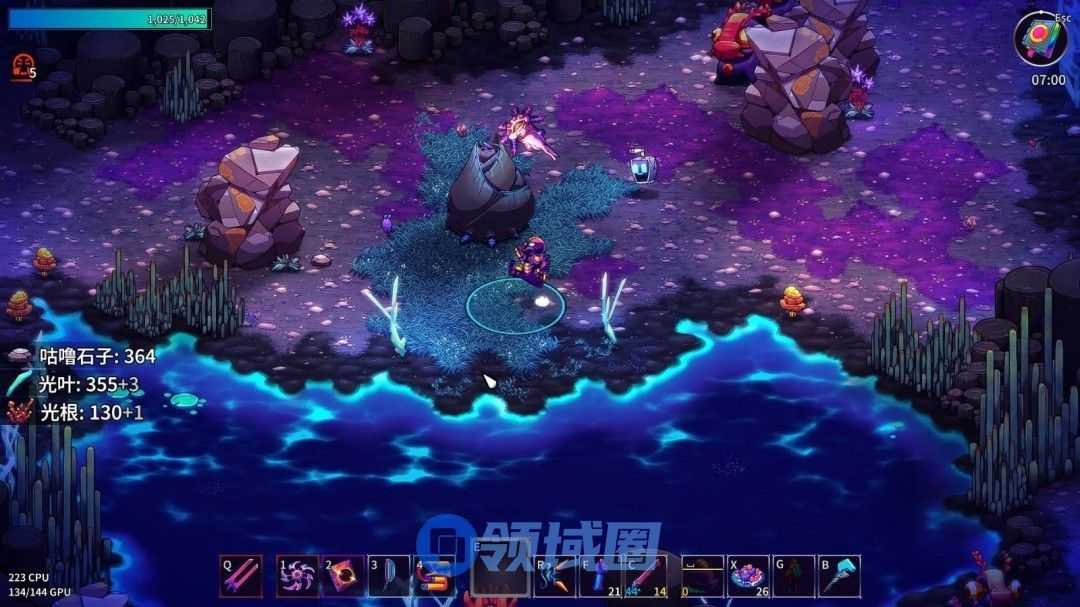 钓鱼会钓上鱼类武器或采集工具,使用几下会飞出然后站在地面上出现的蓝圈就能接住。