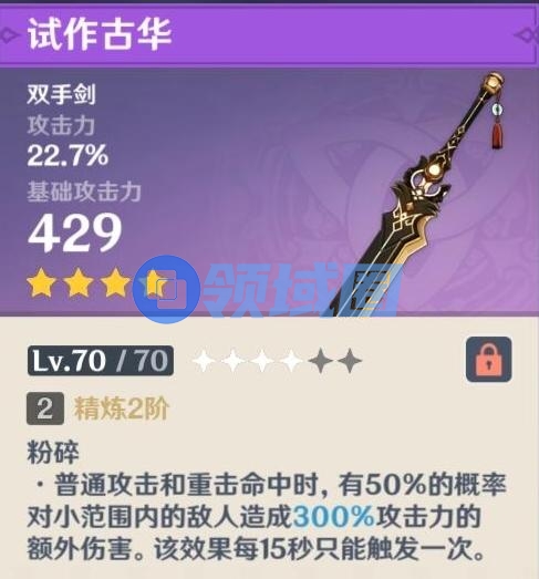 纯攻击型加成大剑,被动高达60%的攻击加成,使得优菈的攻击面板数值大增,在没有松籁的前提下,是优菈武器的第二选择。而且这把武器也比较好出,常驻与up都容易歪出来。