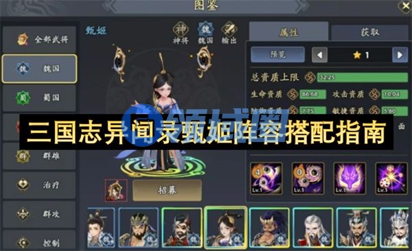 三国志异闻录中魏国的甄姬以其强大的远程单体输出能力和出色的控制效果,成为了许多玩家心目中的核心武将。她的高爆发伤害和穿透防御能力,让她在战场上能够轻松压制敌方前排或核心单位。然而,要充分发挥甄姬的潜力,合理的技能加点和阵容搭配至关重要。