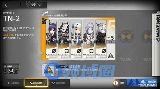 2、定向试炼将会提供5名预选干员组成的小队,在该模式下,您可以带领预先固定的部分干员和自主搭配的干员在一些增益效果的加成下进行挑战。