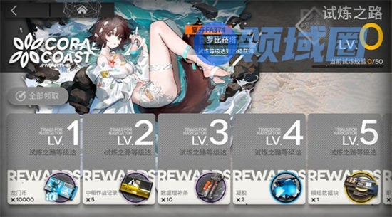 通过活动关卡作战,完成试炼任务累积试炼经验,提升试炼之路等级,可以获得相应的活动奖励,包括时装[珊瑚海岸系列 - “夏卉 FA374” - 罗比菈塔]、寻访凭证、模组养成材料、高级养成素材、作战记录、龙门币等。