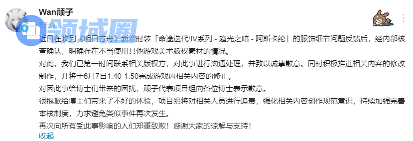 对此核心负责人也表态:近日在收到《明日方舟》新增时装「命途迭代/IV系列 - 趋光之暗 - 阿斯卡纶」的服饰细节问题反馈后,经内部核查确认,明确存在不当使用其他游戏美术版权素材的情况。