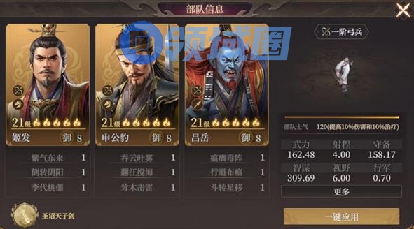 开战后申公豹、吕岳二人自带术法叠弱水buff,脸好的话一回合内即可叠4层,打出高额伤害。稳妥起见姬发可以带划陆为江(弱水层数提升75%-150%),确保堆满5层弱水。倒转阴阳提升容错,追求极限伤害可换补天浴日。