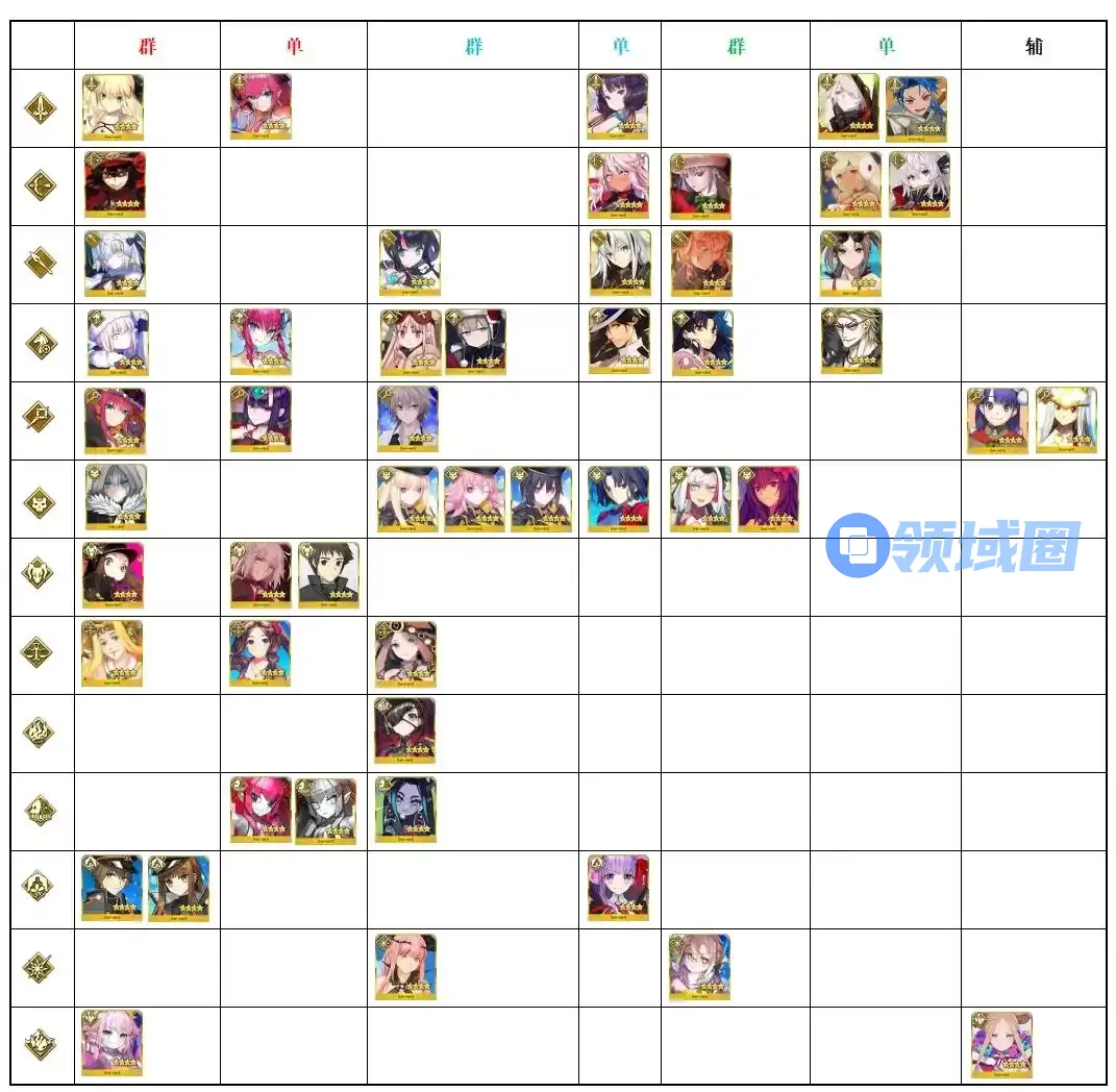 以上是除了盾阶之外各个职阶各种宝具类型的实装情况,整体来说各个职阶在光炮上的数量倒是比较齐全,现在需要补充的主要还是单体宝具方面,毕竟如果冠位战斗是剑阶冠位战那种模式的话,单体要光炮好用许多。