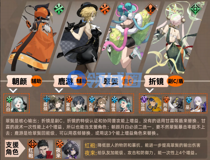 作用:折镜的“特级认证”和“协同普攻”可以为翠鬓提供增益效果,进一步提升输出能力,如果没有折镜,可以用甘霖、刑身或巫等盾角色替换,甘霖的战术技能一次性能上4个增益,也能作为支援角色。