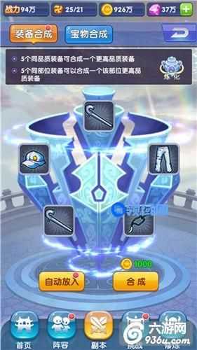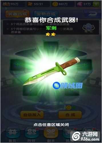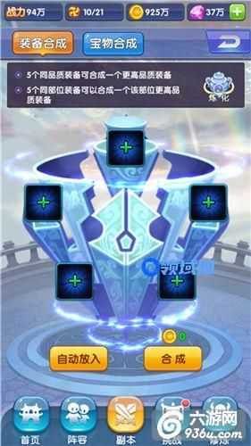 2、5个相同部位的装备可以合成出1个同样部位的装备且品质更高。游戏里装备的品质也用颜色来区分,最低从绿色开始,蓝色,紫色,橙色,红色,最高是金色。合成功能最贴心的地方就是让每个看似过时的装备都变得有用了,给每一位玩家希望。
