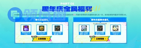 1、活动期间在该页面可以领取周年礼包,充值6元还有额外的礼包可领取;