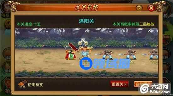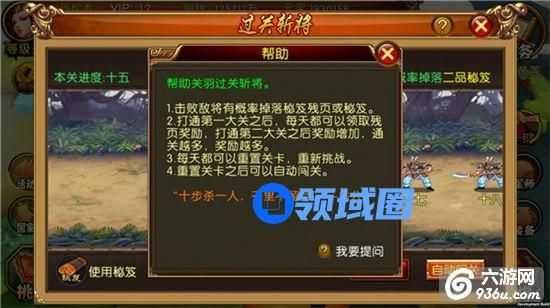 玩家达到50级系统开启过关斩将副本。这里主要产出秘籍和秘籍残页,这些是提升武将三围属性的重要道具。