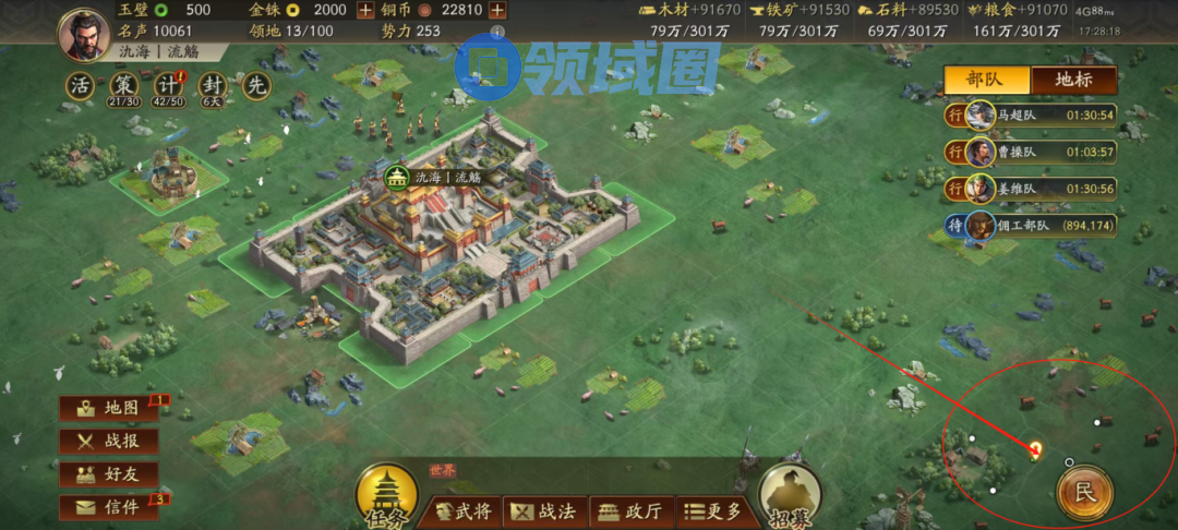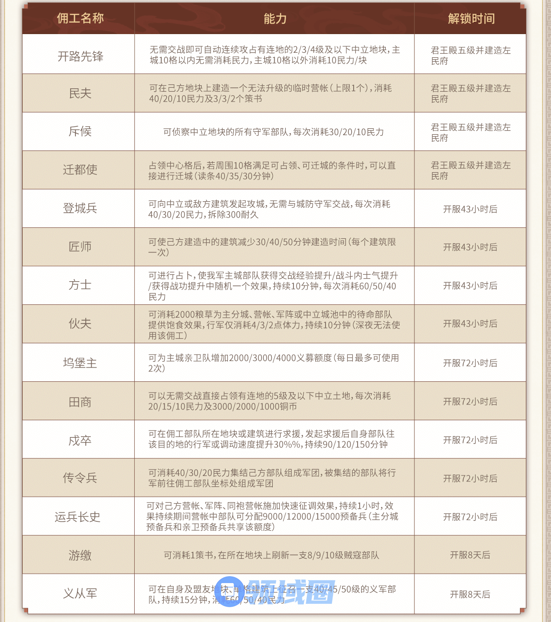 其初始移动速度为100点(升至左民府满级可提升20%),不同的佣工消耗不同的民力(6分钟恢复1点民力)。这里注意,佣工部队可被非友好玩家击败从而导致指令失效。