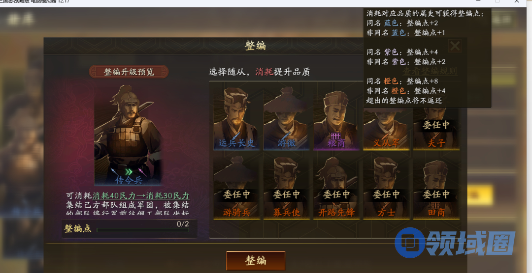 可通过整编进行升级来提升效果和减少民力消耗,使用同名整编更快升级。