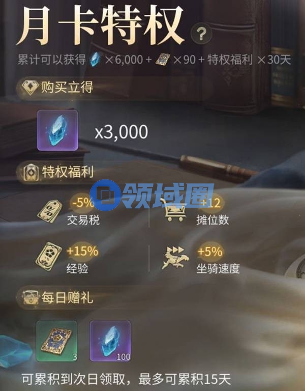 月卡特权:激活后获得额外15%经验加成,适用于绝大多数任务与战斗。